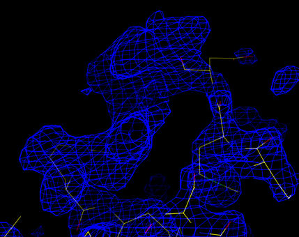The free R-value of the model has now dropped to 30.6%. Inspection of the electron density map followed by manual rebuilding is now performed to improve the model. A cross-validated, sigma-A weighted, phase combined 2Fo-Fc map is calculated. Inspection of this map will help locate areas of the model which are in error. It would also be helpful to look at a difference map (at both positive and negative contour) at the same time. Here the map is calculated using the CNS task file model_map_2fofc.inp: