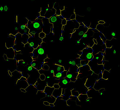 After this refinement the twinned free R-value is 20.3% and the twinned R-value is 16.3%. The next step is to locate the water molecules which can be seen in a gradient map. The is gradient map is calculated using the CNS task file model_map_twin.nip: